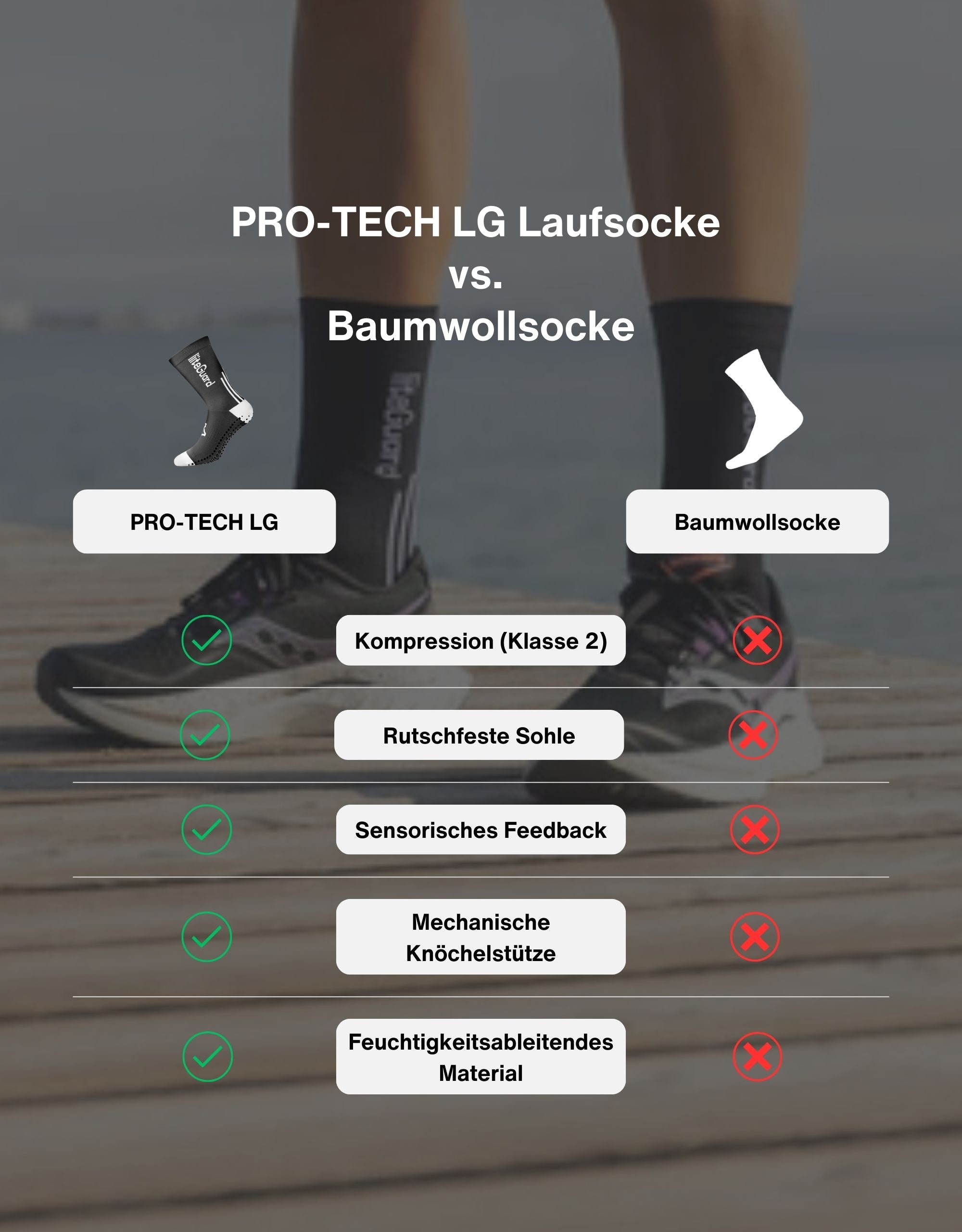 Holen Sie sich maximale Unterstützung um Knöchel und Achillessehne mit unseren mittelhohen PRO-TECH-Kompressionssocken. Die strategisch platzierten Silikonnoppen sorgen für einen stabilen Halt im Schuh und helfen Blasen zu vermeiden. Sie eignet sich besonders gut für Sportarten mit anspruchsvollen Richtungswechseln.