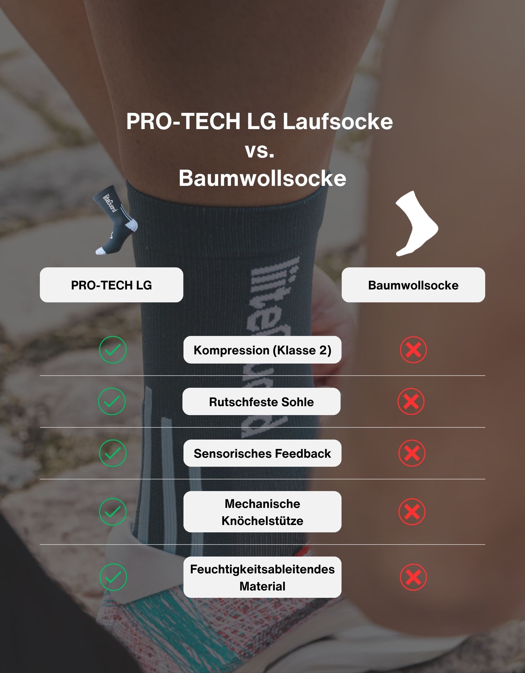 Holen Sie sich maximale Unterstützung um Knöchel und Achillessehne mit unseren mittelhohen PRO-TECH-Kompressionssocken. Die strategisch platzierten Silikonnoppen sorgen für einen stabilen Halt im Schuh und helfen Blasen zu vermeiden. Sie eignet sich besonders gut für Sportarten mit anspruchsvollen Richtungswechseln.