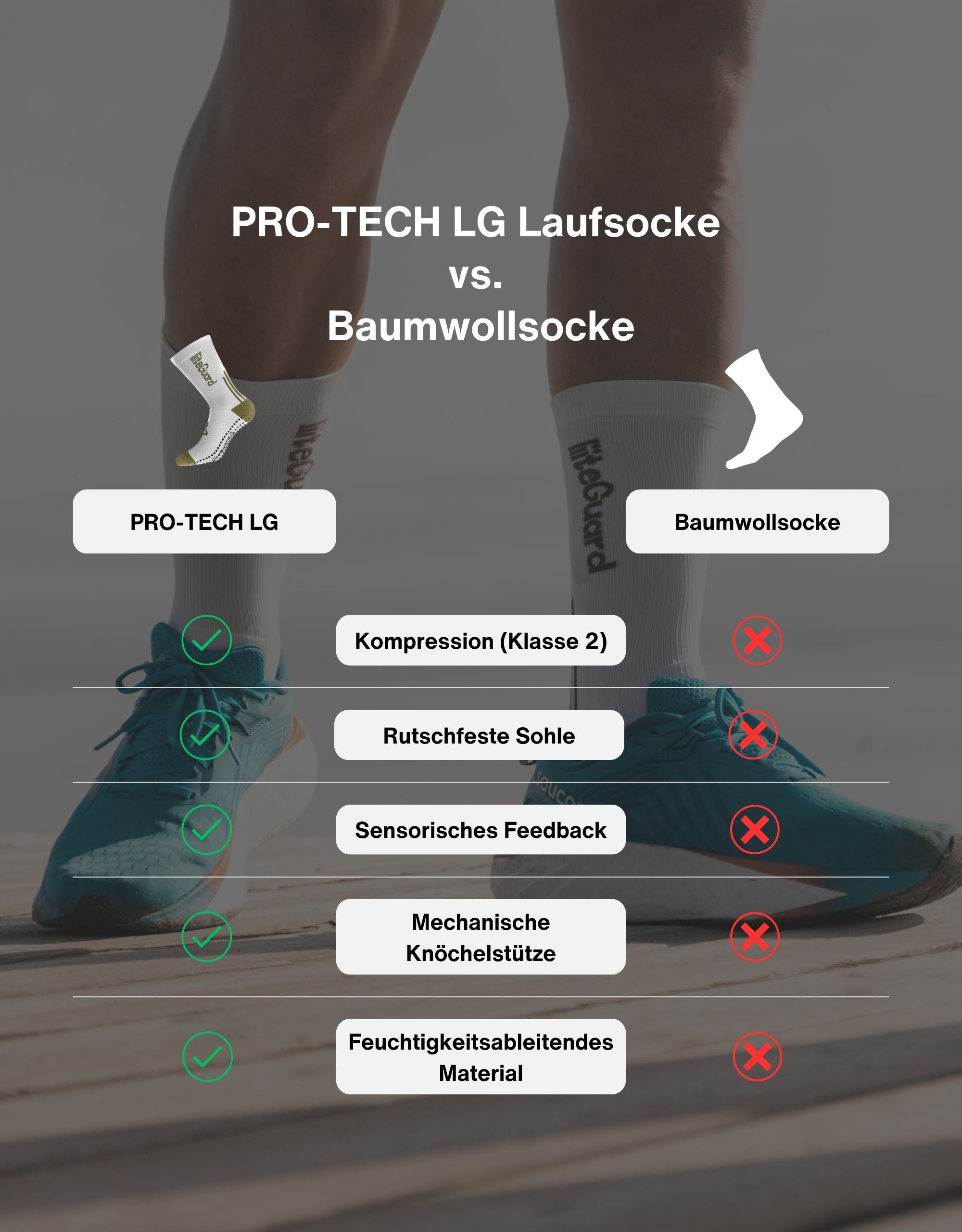 Holen Sie sich maximale Unterstützung um Knöchel und Achillessehne mit unseren mittelhohen PRO-TECH-Kompressionssocken. Die strategisch platzierten Silikonnoppen sorgen für einen stabilen Halt im Schuh und helfen Blasen zu vermeiden. Sie eignet sich besonders gut für Sportarten mit anspruchsvollen Richtungswechseln.